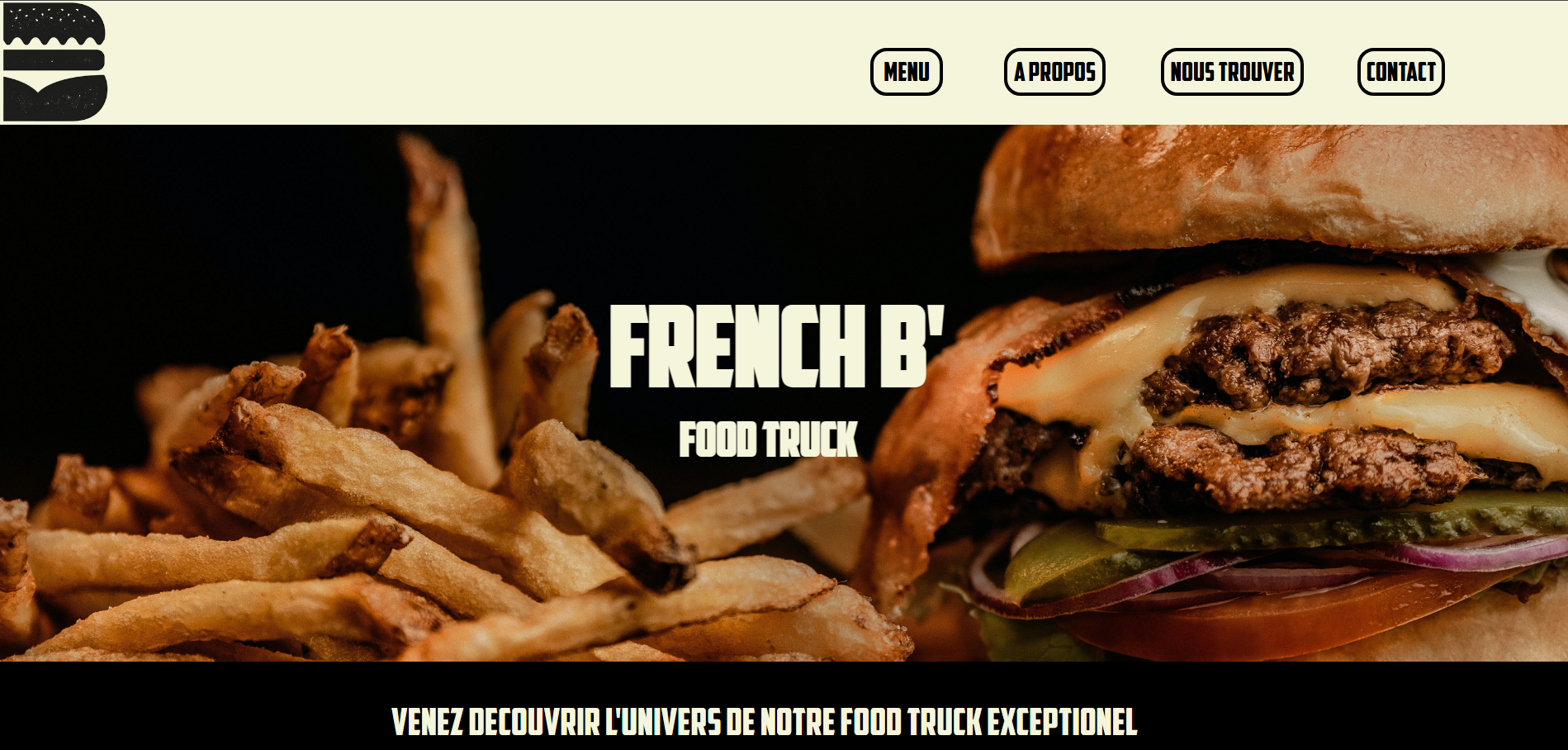 Dans le cadre d'un projet, Nous devions produire un site Web qui présente les services proposés par un food-truck avec des éléments bilingues. Le site contient un ensemble de pages statiques. Une page Menu est affichée à partir d’un jeu de données structurées. Le site produit est conforme à la norme HTML du W3C. Avec ce Projet j'ai pu utiliser mes compétences ,acquises durant les ressources, dans un cas concret qui m'a permis de comprendre comment créer penser un site web pour une demande bien spécifique. Le concept de "French B' Burger » est un Food truck spécialisé dans la préparation et la vente de burgers avec des produits normands.